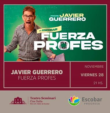 "Fuerza profes" es el stand up del Profe Javier Guerrero. Después del éxito en redes sociales el personaje se escapa del celu y del aula para llegar al teatro y recorrer juntos las más disparatadas experiencias del mundo escolar, reírnos de nosotros mismos y de un sistema que busca enloquecernos. ¿Cómo no perder la cordura? ¿cómo no colapsar? y ¿cómo salir indemnes de esta experiencia desafiante y maravillosa que es educar? Todo esto es lo que intentaremos revelar en este show planificado para intensificar la risa y profundizar nuestro amor por la profesión más bella del mundo.