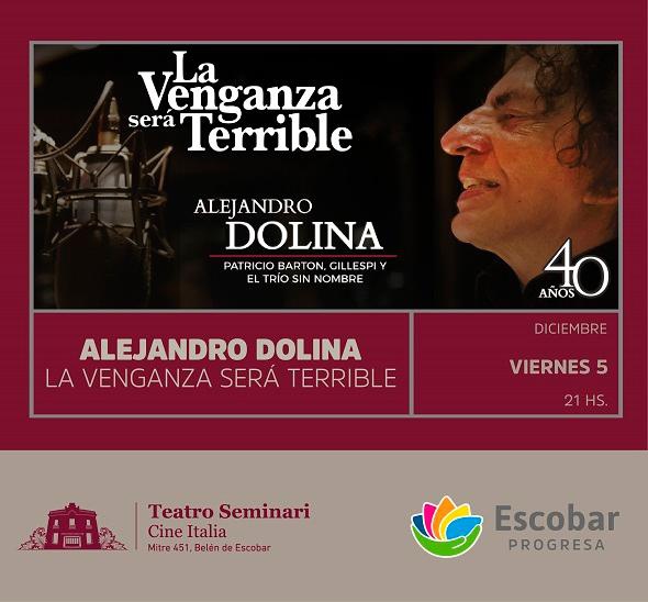 El viernes 5 de diciembre a las 21hs se presentará en el Teatro Seminari de Escobar "La venganza Será Terrible", el espectáculo radial llevado al teatro que conduce Alejandro Dolina. Lo acompañan Patricio Barton, Gillerpi y el Trío sin nombre integrado por: Ale Dolina, Martín Dolina y Manuel Moreira.