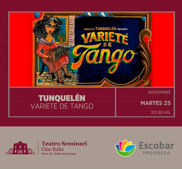 La Orquesta de Instrumentos Latinoamericanos TUNQUELÉN presenta su nueva obra conceptual denominada “Varieté de Tango”. Un concierto que propone un recorrido musical, visual y emocional por distintas facetas del espíritu porteño, desde la picardía del sainete y la murga hasta la profundidad del tango y la experimentación contemporánea de la música ciudadana.Tunquelén, junto a artistas invitados, invita a un viaje sonoro por el alma de Buenos Aires, con una puesta escénica dinámica, integrando música e historia.La recaudación será íntegramente destinada a APANNE (Asociación padres y amigos del niño neurológico de Escobar).